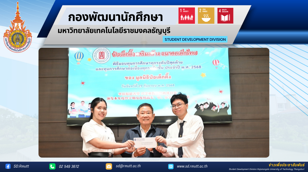 ตุลาคม 1, 2025มูลนิธิป่อเต็กตึ๊ง มอบทุนการศึกษา ประจำปีการศึกษา 2568 นำโดย มีคุณสัก กอแสงเรือง รองประธานกรรมการ เป็นประธานในพิธี พร้อมด้วย คุณวิชิต ชินวงศ์วรกุล รองประธานกรรมการ คุณวิรุฬ เตชะไพบูลย์ ที่ปรึกษาประธานกรรมการ คุณจารุรัตน์ คุณัตถานนท์ กรรมการและเหรัญญิก คุณสุรพงษ์ เตชะหรูวิจิตร กรรมการและรองเลขาธิการ คณะกรรมการและผู้ช่วยกรรมการมูลนิธิฯ ร่วมในพิธีมอบทุนการศึกษา โดยนักศึกษาของมหาวิทยาลัยเทคโนโลยีราชมงคลธัญบุรี ได้รับทุนการศึกษา จำนวน 2 ทุน ในวันจันทร์ที่ 29 กันยายน 2568 เวลา 10.30 น. ณ ห้องประชุมชั้น 2 อาคาร 2 สำนักงานมูลนิธิป่อเต็กตึ๊ง ถนนพลับพลาไชย เขตป้อมปราบฯ กรุงเทพมหานคร