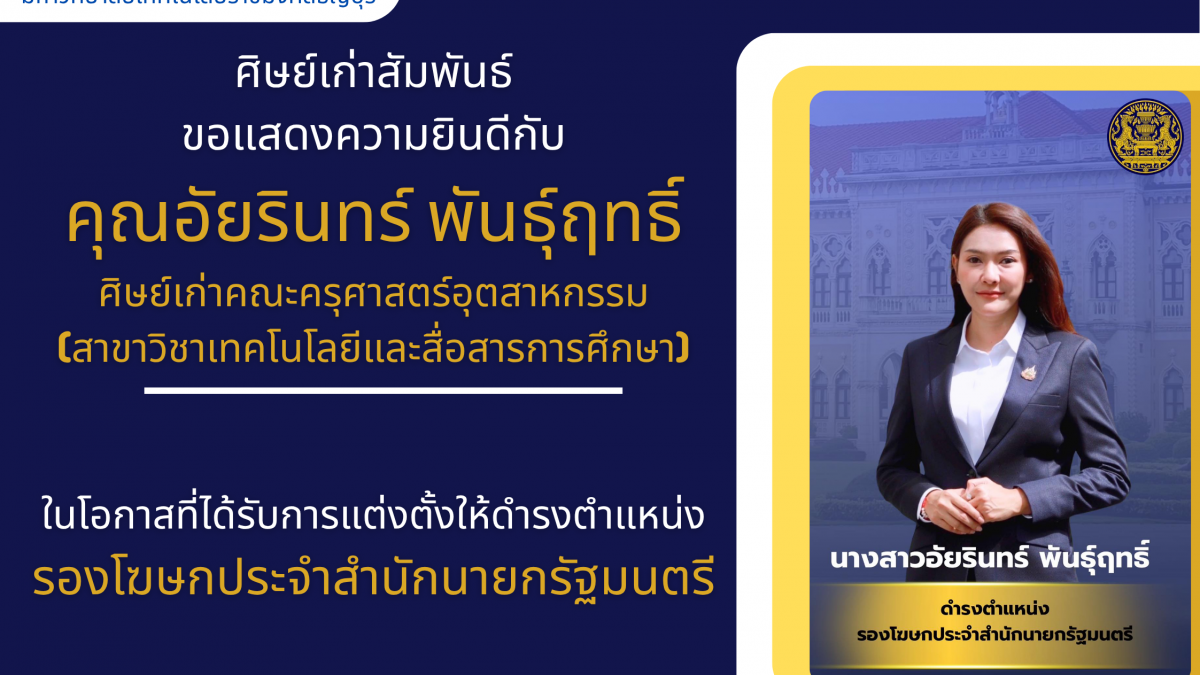 ตุลาคม 10, 2025ศิษย์เก่าสัมพันธ์ขอแสดงความยินดีกับคุณอัยรินทร์ พันธุ์ฤทธิ์ ศิษย์เก่าคณะครุศาสตร์อุตสาหกรรม (สาขาวิชาเทคโนโลยีเเละสื่อสารการศึกษา) ในโอกาสที่ได้รับการแต่งตั้งให้ดำรงตำแหน่ง รองโฆษกประจำสำนักนายกรัฐบาล