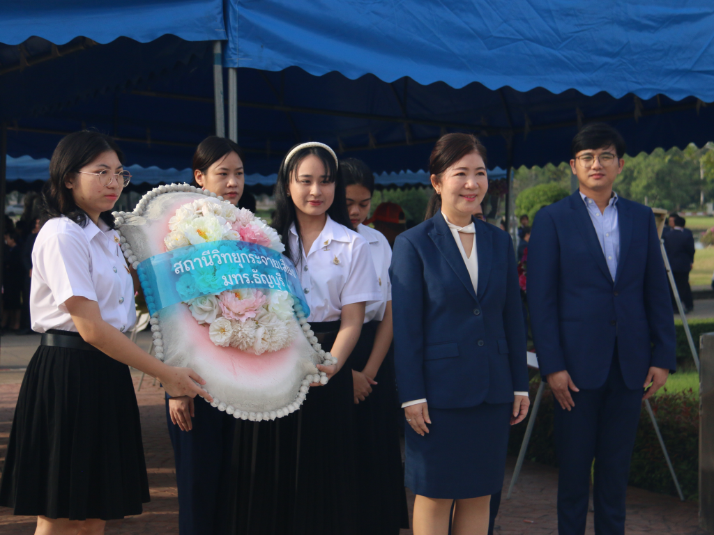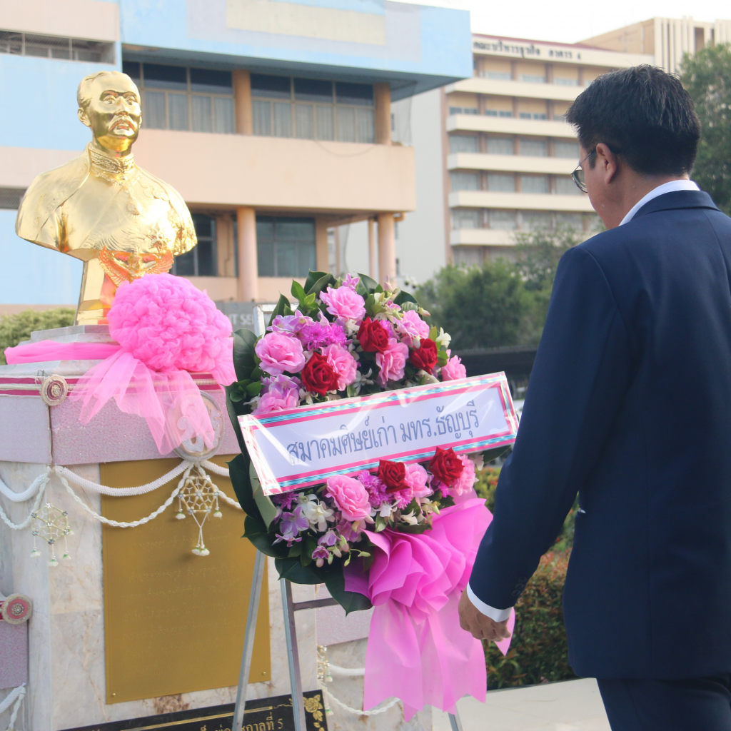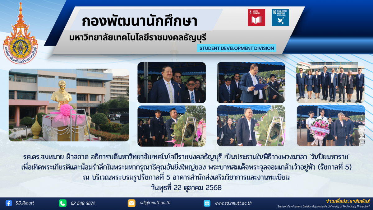 รศ.ดร.สมหมาย ผิวสอาด อธิการบดีมหาวิทยาลัยเทคโนโลยีราชมงคลธัญบุรี เป็นประธานในพิธีวางพวงมาลา ‘วันปิยมหาราช’ เพื่อเทิดพระเกียรติและน้อมรำลึกในพระมหากรุณาธิคุณอันยิ่งใหญ่ของ พระบาทสมเด็จพระจุลจอมเกล้าเจ้าอยู่หัว (รัชกาลที่ 5) ณ บริเวณพระบรมรูปรัชกาลที่ 5 อาคารสำนักส่งเสริมวิชาการและงานทะเบียน วันพุธที่ 22 ตุลาคม 2568