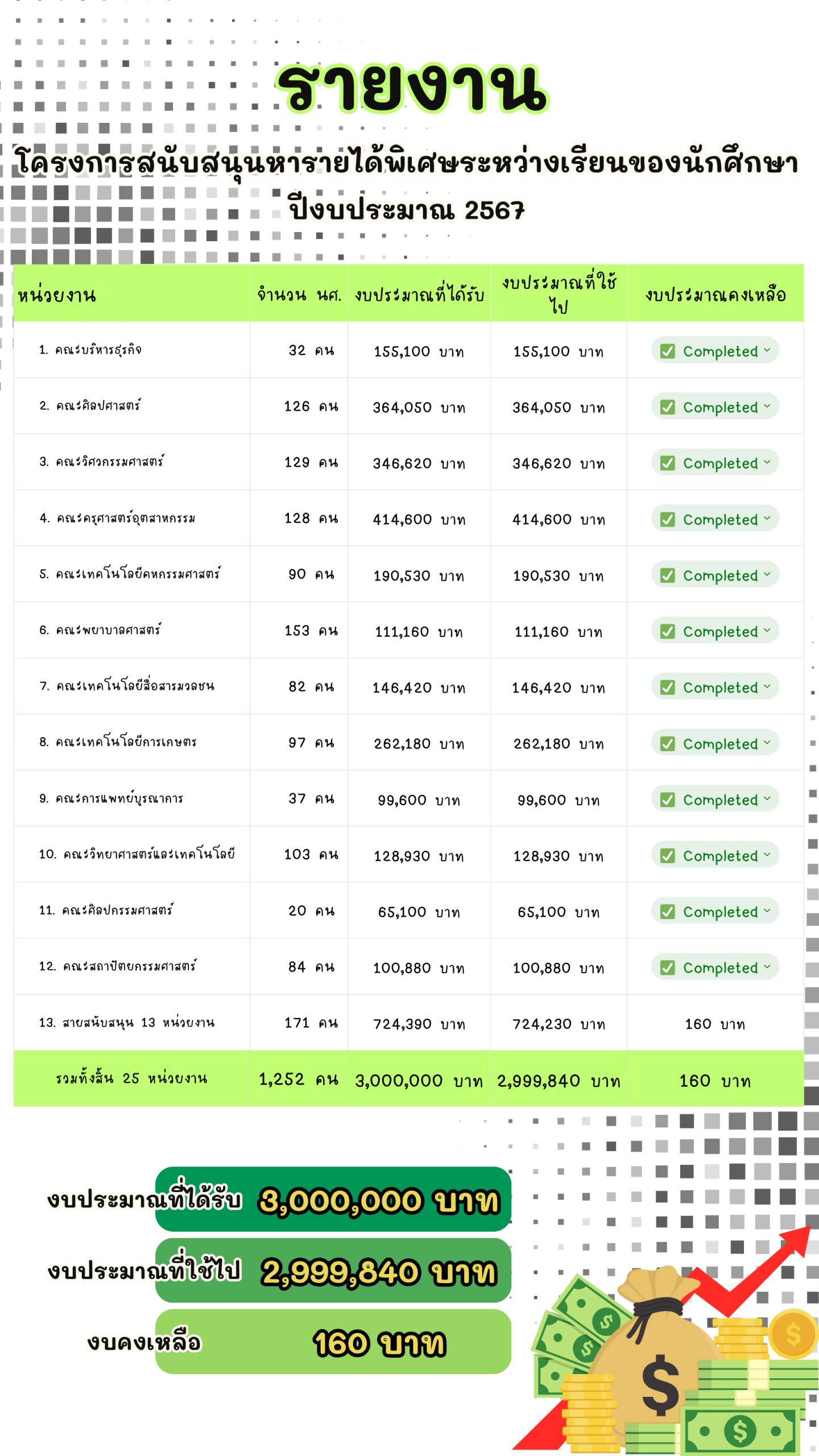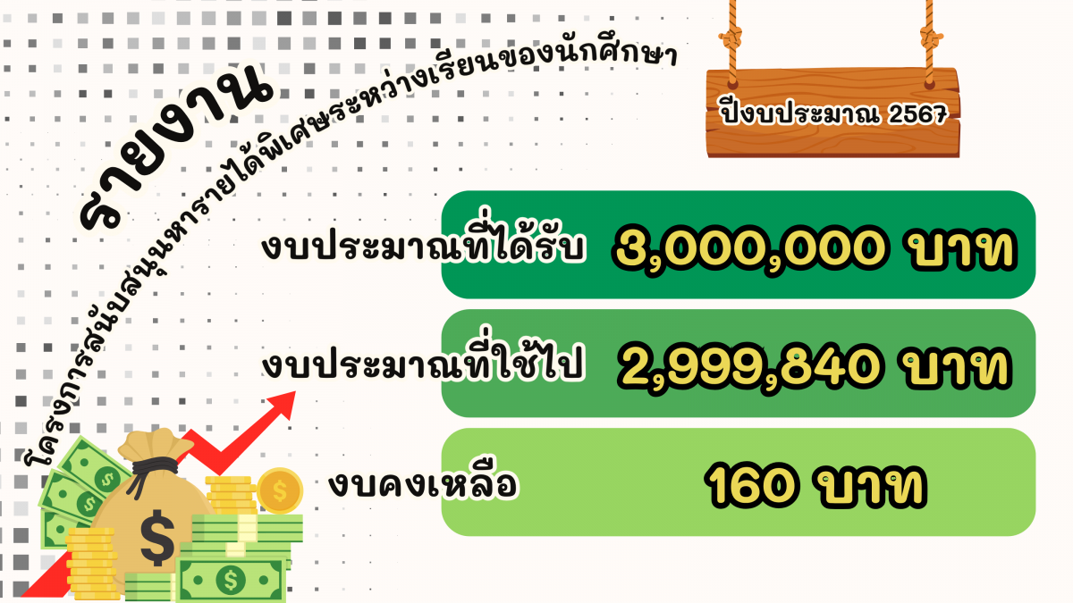 มหาวิทยาลัยเทคโนโลยีราชมงคลธัญบุรี ได้อนุมัติงบประมาณ จำนวน 3,000,000 บาท (สามล้านบาทถ้วน) ให้กองพัฒนานักศึกษา ดำเนินการจัดโครงการสนับสนุนการหารายได้พิเศษระหว่างเรียนของนักศึกษา ประจำปีงบประมาณ 2567