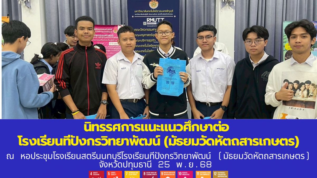 ฝ่ายเเนะเเนวการศึกษา อาชีพ และศิษย์เก่าสัมพันธ์ กองพัฒนานักศึกษา มหาวิทยาลัยเทคโนโลยีราชมงคลธัญบุรี ได้เข้าร่วมกิจกรรม “เส้นทางทางการศึกษาเพื่ออนาคตที่ใช่ ” ระดับมัธยมศึกษาปีที่ 6 ปีการศึกษา 2568 ของโรงเรียนทีปังกรวิทยาพัฒน์ (มัธยมวัดหัตถสารเกษตร) จังหวัดปทุมธานี เพื่อเปิดโอกาสให้นักเรียนเข้าเยี่ยมชมบูธสถาบันการศึกษา 30 กว่าสถาบัน โดยมีคณะเทคโนโลยีคหกรรมศาสตร์ คณะวิทยาศาสตร์และเทคโนโลยี เเละคณะวิศวกรรมศาสตร์ เข้าร่วมกิจกรรมในครั้งนี้ วันอังคารที่ 25 พฤศจิกายน 2568 ณ หอประชุม โรงเรียนทีปังกรวิทยาพัฒน์ (มัธยมวัดหัตถสารเกษตร) จังหวัดปทุมธานี
