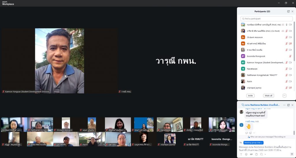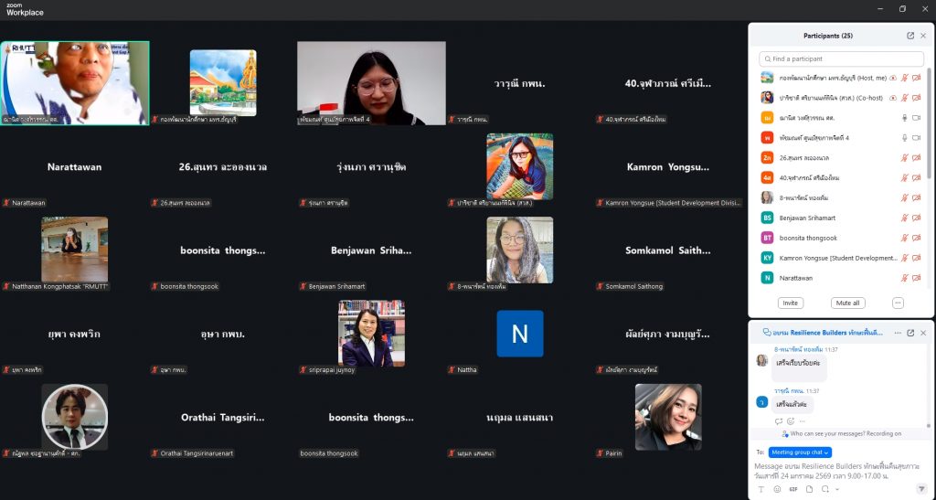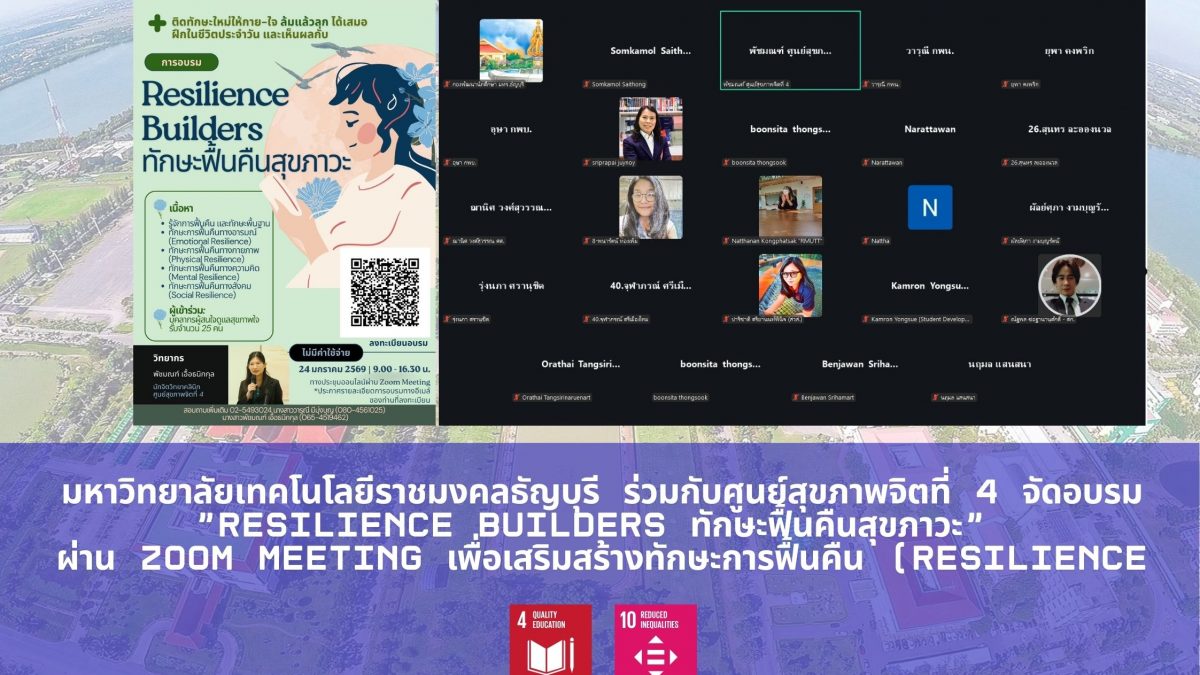 กองพัฒนานักศึกษา มหาวิทยาลัยเทคโนโลยีราชมงคลธัญบุรี ร่วมกับศูนย์สุขภาพจิตที่ 4 จัดอบรม “Resilience Builders ทักษะฟื้นคืนสุขภาวะ” ผ่าน Zoom Meeting เพื่อเสริมสร้างทักษะการฟื้นคืน (Resilience) ในการดูแลจิตใจและความเครียดเพื่อสุขภาวะที่ดีแก้อาจารย์และบุคลากรที่สนใจดูแลสุขภาพใจตนเองให้สามารถจัดการภาวะเครียดได้อย่างมีประสิทธิภาพและนำความรู้ไปดูแลนักศึกษาและคนใกล้ชิด ตั้งแต่เวลา 9.00-16.00 น.โดยมีผู้ช่วยศาสตราจารย์คำรณ ย่องซื่อเป็นประธานกล่าวต้อนรับและให้ข้อมูลภาวะสุขภาพจิตในมหาวิทยาลัย และวิทยากรคุณพัชมณฑ์ เอื้อธนิกกุล นักจิตวิทยาคลินิกจากศูนย์สุขภาพจิตที่ 4 กรมสุขภาพจิต ให้เกียรติเป็นวิทยากร เมื่อวันเสาร์ที่ 24 มกราคม 2569 รูปแบบออนไลน์