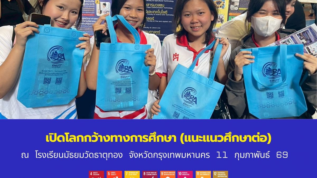 ฝ่ายเเนะเเนวการศึกษา อาชีพ และศิษย์เก่าสัมพันธ์ กองพัฒนานักศึกษา มหาวิทยาลัยเทคโนโลยีราชมงคลธัญบุรี ได้เข้าร่วมกิจกรรม “เปิดโลกกว้างทางการศึกษา (แนะแนวศึกษาต่อ)” โรงเรียนมัธยมวัดธาตุทอง เป็นโรงเรียนมัธยมศึกษาขนาดใหญ่ประเภทสหศึกษา และเป็นส่วนราชการ สังกัดสำนักงานเขตพื้นที่การศึกษากรุงเทพมหานคร เขต 2 สำนักงานคณะกรรมการการศึกษาขั้นพื้นฐาน กระทรวงศึกษาธิการ โดยมีสถาบัน มากกว่า 30 สถาบัน ให้นักเรียน คณาจารย์สอบถาม หลักสูตร สาขา คณะที่รองรับ ของนักเรียนที่สนใจศึกษาต่อในระดับปริญญาตรี ในรอบ TCAS 2-2569 โดยมีคณะศิลปศาสตร์ คณะการแพทย์บูรณาการ คณะบริหารธุรกิจ และคณะวิทยาศาสตร์และเทคโนโลยี การเข้าร่วมในครั้งนี้ ณ โรงเรียนมัธยมวัดธาตุทอง จังหวัดกรุงเทพมหานคร