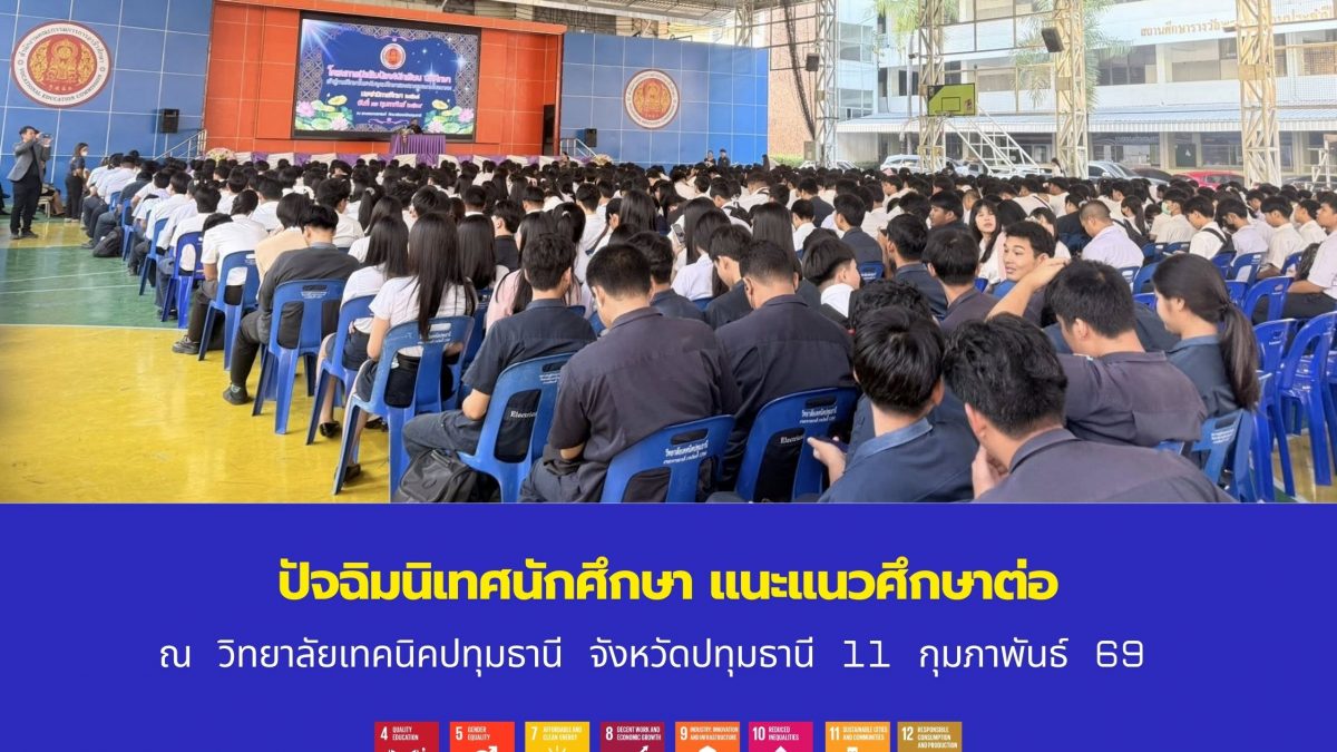 ฝ่ายเเนะเเนวการศึกษา อาชีพ และศิษย์เก่าสัมพันธ์ กองพัฒนานักศึกษา มหาวิทยาลัยเทคโนโลยีราชมงคลธัญบุรี ได้เข้าร่วมกิจกรรม “ปัจฉิมนิเทศนักศึกษาระดับประกาศนียบัตรวิชาชีพชั้นปีที่ 3 และประกาศนียบัตรวิชาชีพชั้นสูง ชั้นปีที่ 2 ” วิทยาลัยเทคนิคปทุมธานี เป็นสังกัด สำนักงานคณะกรรมการการอาชีวศึกษา (สอศ.) สำนักงานคณะกรรมการการอาชีวศึกษา กระทรวงศึกษาธิการ โดยปัจจุบันขึ้นตรงกับสถาบันการอาชีวศึกษาภาคกลาง 1 ตั้งอยู่ในอำเภอเมือง จังหวัดปทุมธานี เปิดสอนระดับประกาศนียบัตรวิชาชีพ (ปวช.), ประกาศนียบัตรวิชาชีพชั้นสูง (ปวส.) และระดับปริญญาตรี โดยมีสถาบัน มากกว่า 30 สถาบัน ให้นักเรียน คณาจารย์สอบถาม หลักสูตร สาขา คณะที่รองรับ ของนักเรียนที่สนใจศึกษาต่อในระดับปริญญาตรี ในรอบสอบตรงเเละรับตรง ของมหาวิทยาลัยฯ โดยมีคณะศิลปศาสตร์ การเข้าร่วมในครั้งนี้ ณ วิทยาลัยเทคนิคปทุมธานี จังหวัดปทุมธานี