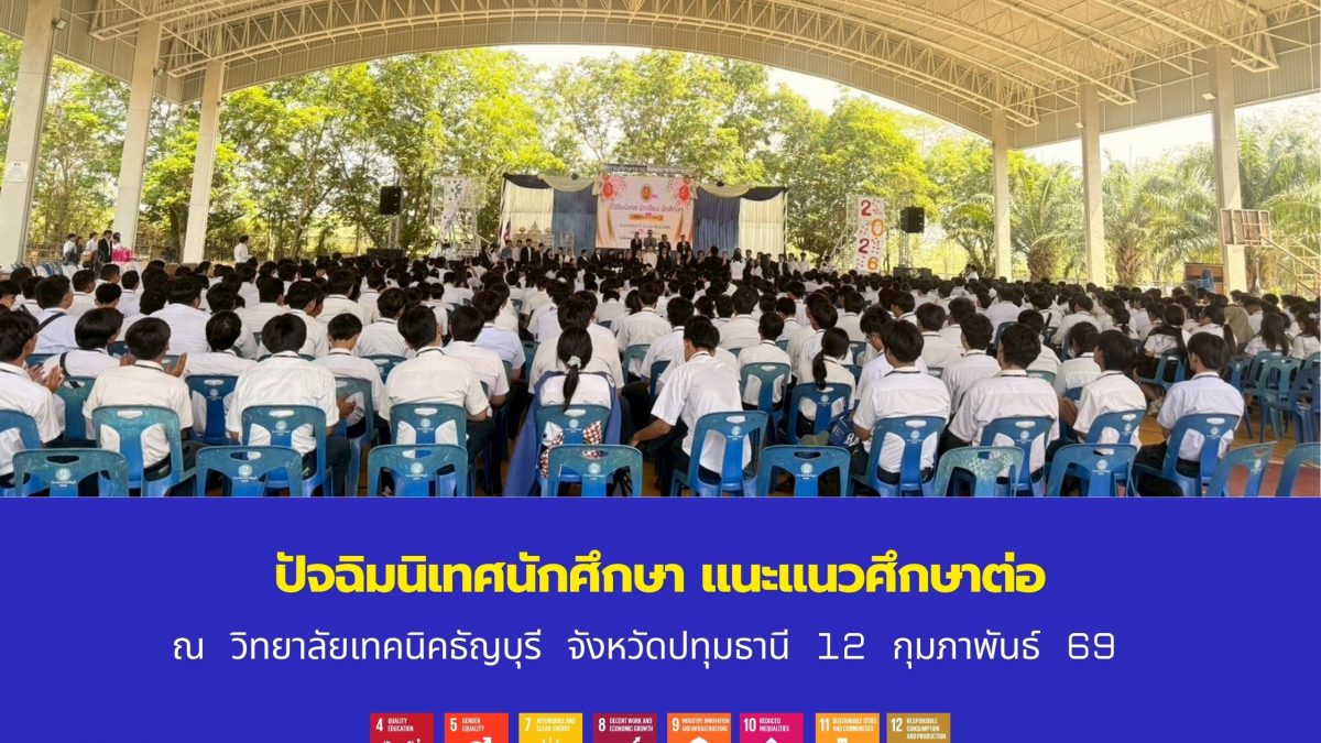 ฝ่ายเเนะเเนวการศึกษา อาชีพ และศิษย์เก่าสัมพันธ์ กองพัฒนานักศึกษา มหาวิทยาลัยเทคโนโลยีราชมงคลธัญบุรี ได้เข้าร่วมกิจกรรม “ปัจฉิมนิเทศนักศึกษาระดับประกาศนียบัตรวิชาชีพชั้นปีที่ 3 และประกาศนียบัตรวิชาชีพชั้นสูง ชั้นปีที่ 2 ” วิทยาลัยเทคนิคธัญบุรี เป็นสังกัด สำนักงานคณะกรรมการการอาชีวศึกษา (สอศ.) สำนักงานคณะกรรมการการอาชีวศึกษา กระทรวงศึกษาธิการ โดยปัจจุบันขึ้นตรงกับสถาบันการอาชีวศึกษาภาคกลาง 1 ตั้งอยู่ในอำเภอธัญบุรี จังหวัดปทุมธานี เปิดสอนระดับประกาศนียบัตรวิชาชีพ (ปวช.), ประกาศนียบัตรวิชาชีพชั้นสูง (ปวส.) และระดับปริญญาตรี โดยมีสถาบัน มากกว่า 10 สถาบัน ให้นักเรียน คณาจารย์สอบถาม หลักสูตร สาขา คณะที่รองรับ ของนักเรียนที่สนใจศึกษาต่อในระดับปริญญาตรี ในรอบสอบตรงเเละรับตรง ของมหาวิทยาลัยฯ โดยมีคณะศิลปศาสตร์ การเข้าร่วมในครั้งนี้ ณ วิทยาลัยเทคนิคธัญบุรี จังหวัดปทุมธานี