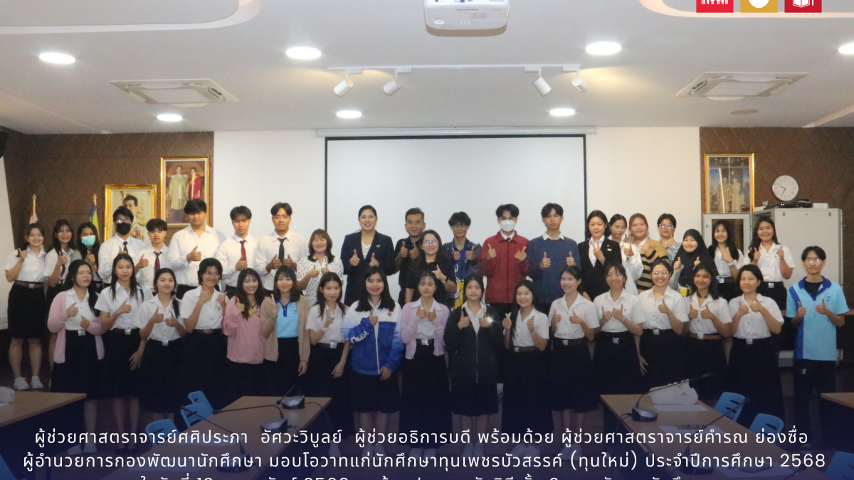 กุมภาพันธ์ 11, 2026ผู้ช่วยศาสตราจารย์ศศิประภา อัศวะวิบูลย์ ผู้ช่วยอธิการบดี พร้อมด้วย ผู้ช่วยศาสตราจารย์คำรณ ย่องซื่อ ผู้อำนวยการกองพัฒนานักศึกษา มอบโอวาทแก่นักศึกษาทุนเพชรบัวสรรค์ (ทุนใหม่) ประจำปีการศึกษา 2568 ในวันที่ 12 กุมภาพันธ์ 2569