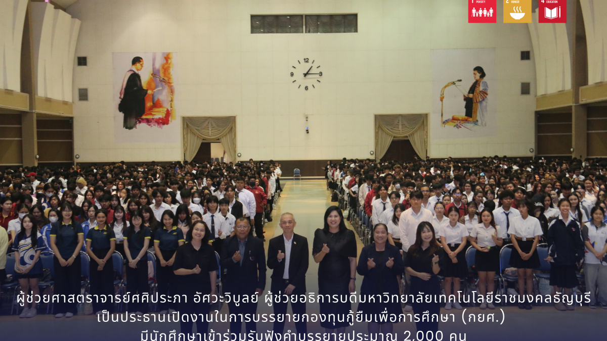 กุมภาพันธ์ 20, 2026ผู้ช่วยศาสตราจารย์ศศิประภา อัศวะวิบูลย์ ผู้ช่วยอธิการบดีมหาวิทยาลัยเทคโนโลยีราชมงคลธัญบุรี เป็นประธานเปิดงานในการบรรยายกองทุนกู้ยืมเพื่อการศึกษา (กยศ.)